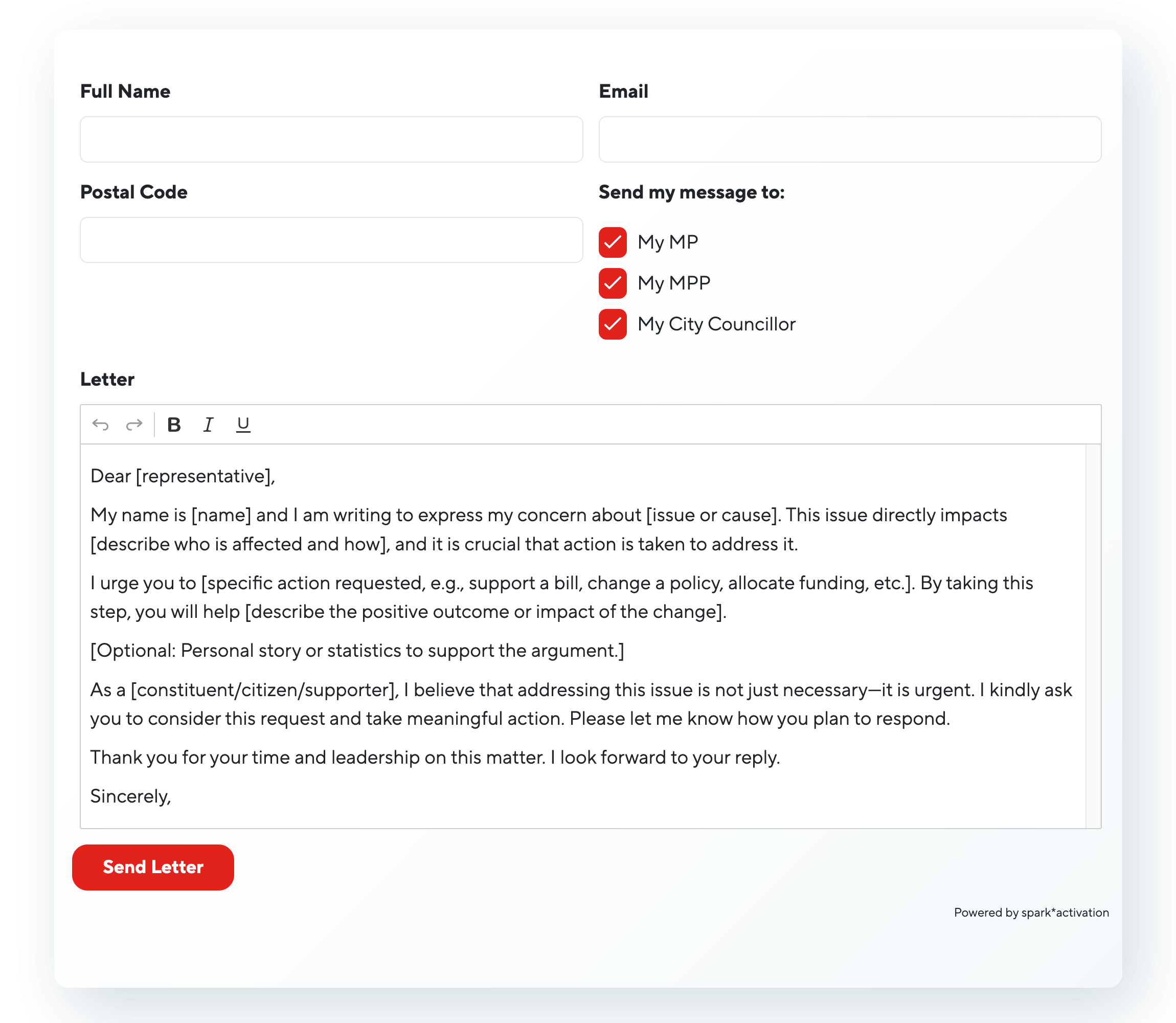 Give your supporters the ability to send letters directly to their local elected officials. From Federal to provincial, having constituents send letters to their MP or MPP/MLA is a powerful way to amplify your message.